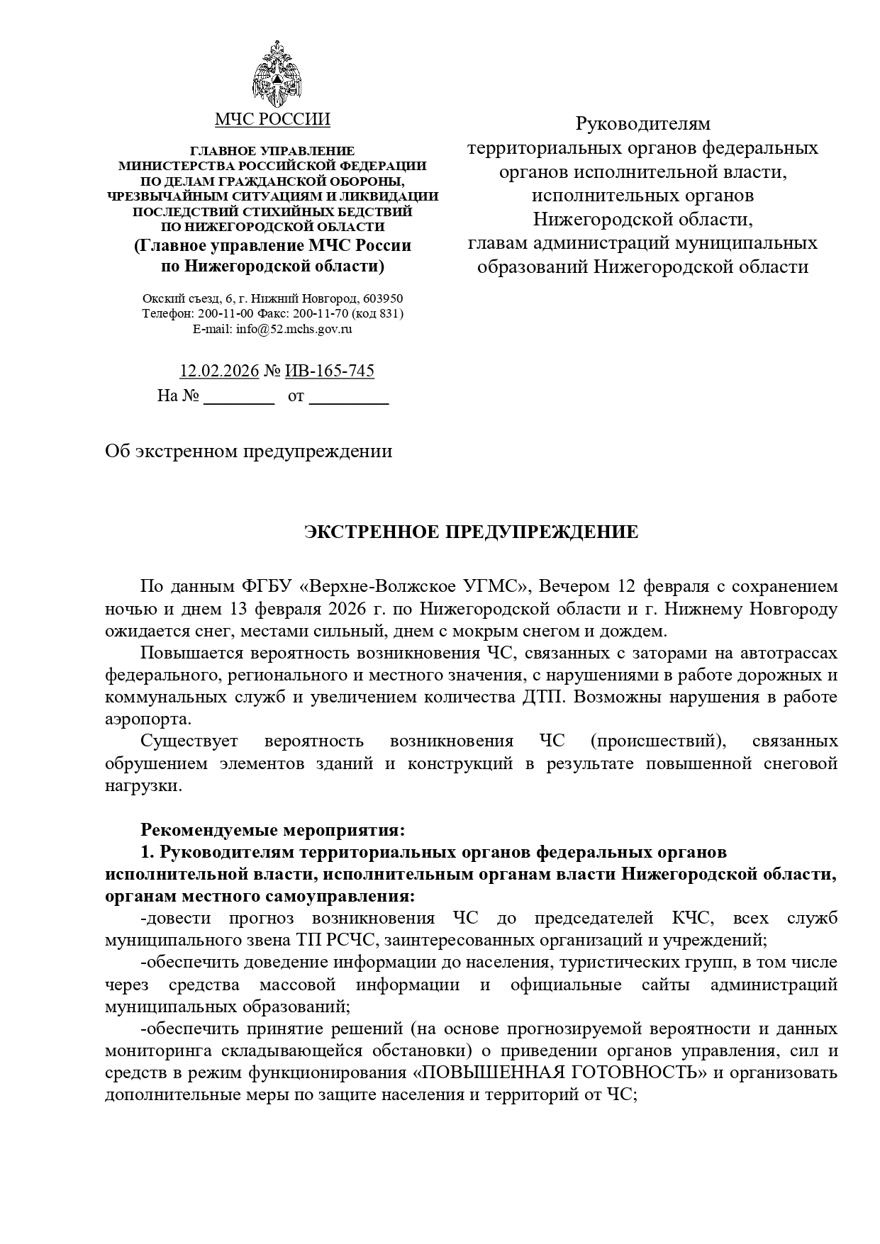 ЭКСТРЕННОЕ ПРЕДУПРЕЖДЕНИЕ о вероятности возникновения чрезвычайных ситуаций на территории Нижегородской области 12 февраля 2026 года